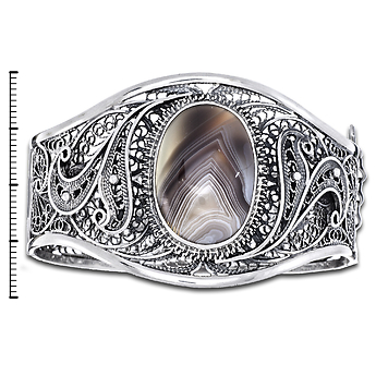 Необычный браслет из серебра ручной работы с выразительным натуральным поделочным камнем - полосатым агатом. Это украшение выполнено в ручной филигранной технике ювелирами художественного центра обработки драгоценных металлов поселка Кубачи. Высота изделия - 4 см.