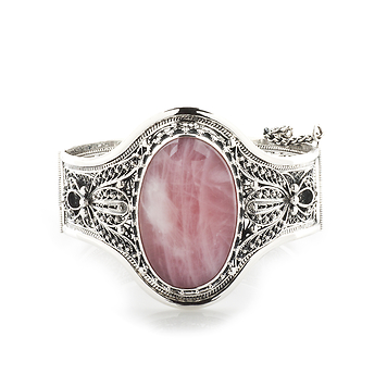 Жесткий серебряный браслет с розовым кварцем ручной работы в технике филигрань