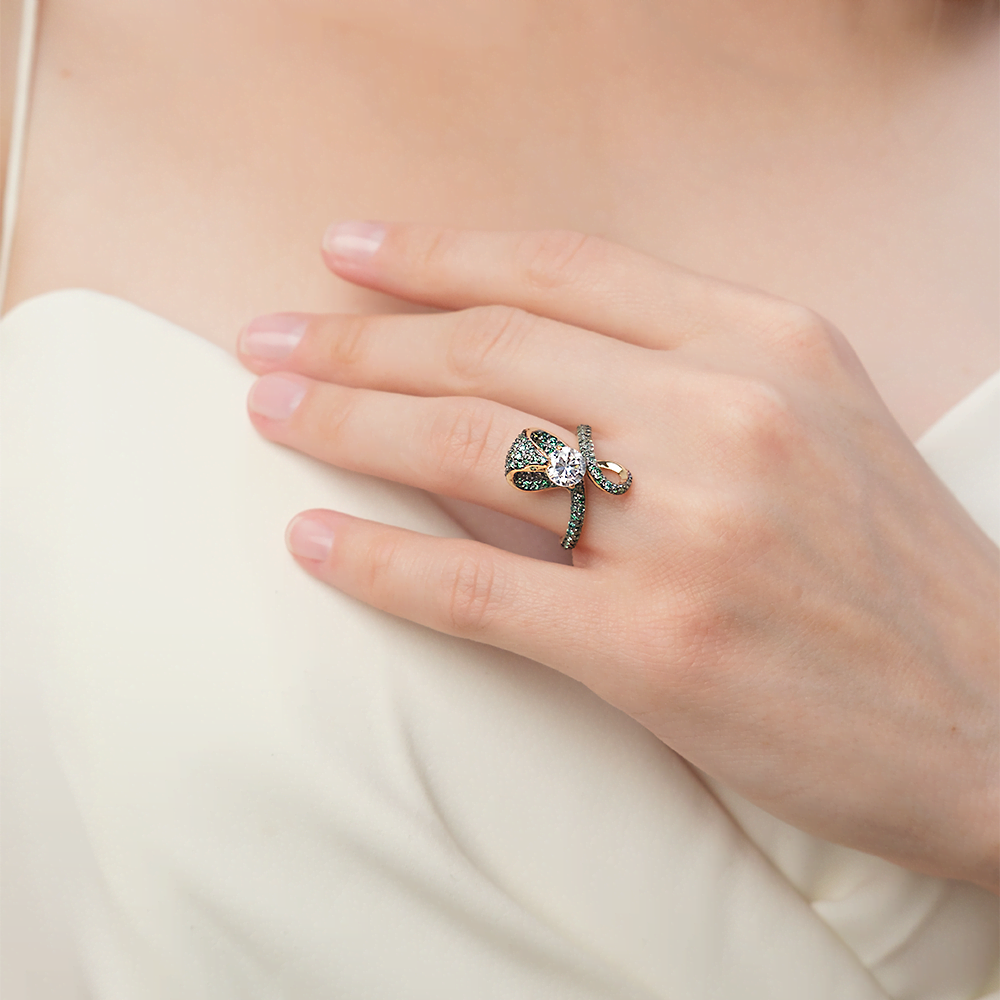 Кольцо, красное золото, кварц дымчатый, хромдиопсид, хризолит
