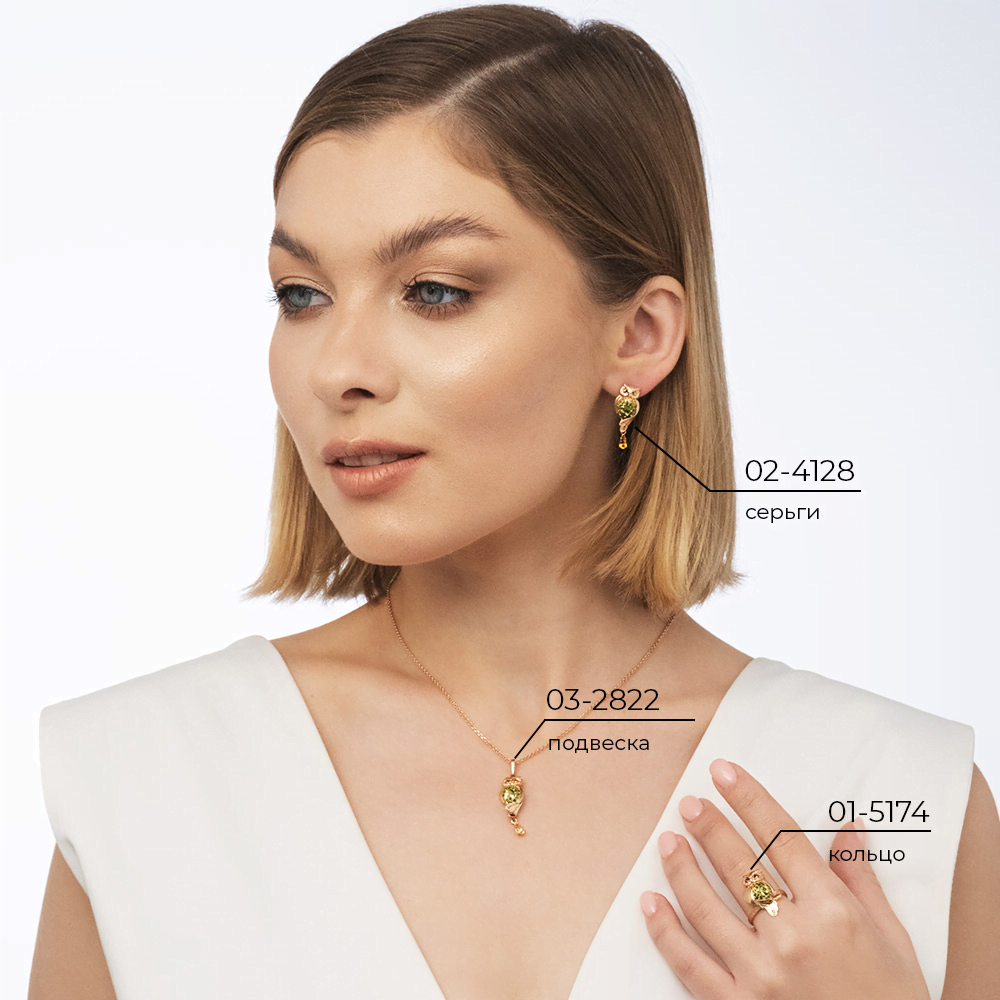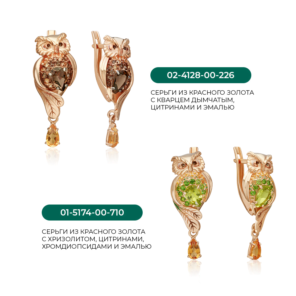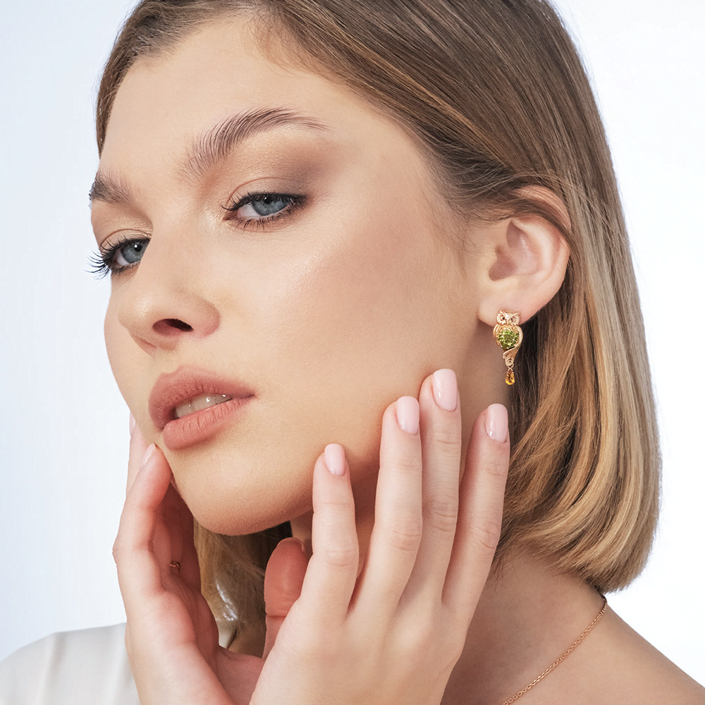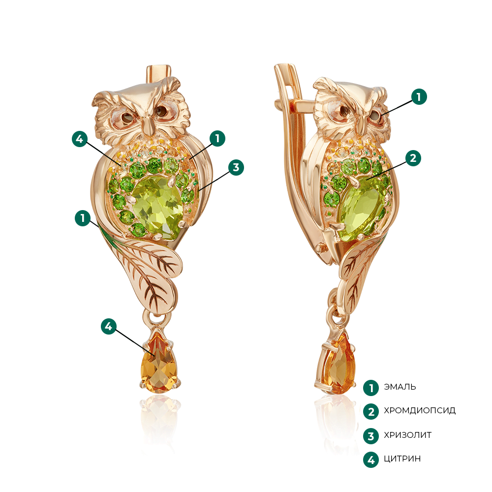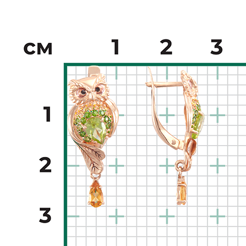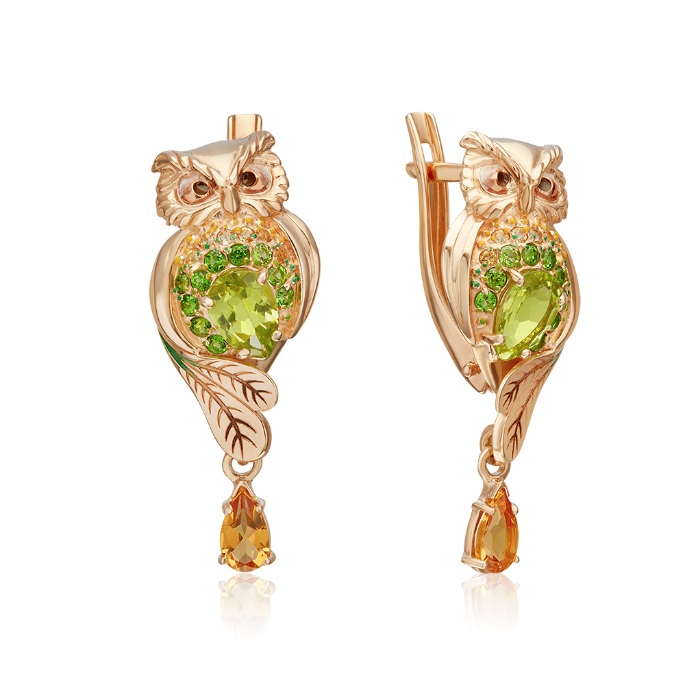 Серьги, красное золото, цитрин, хризолит, хромдиапсид