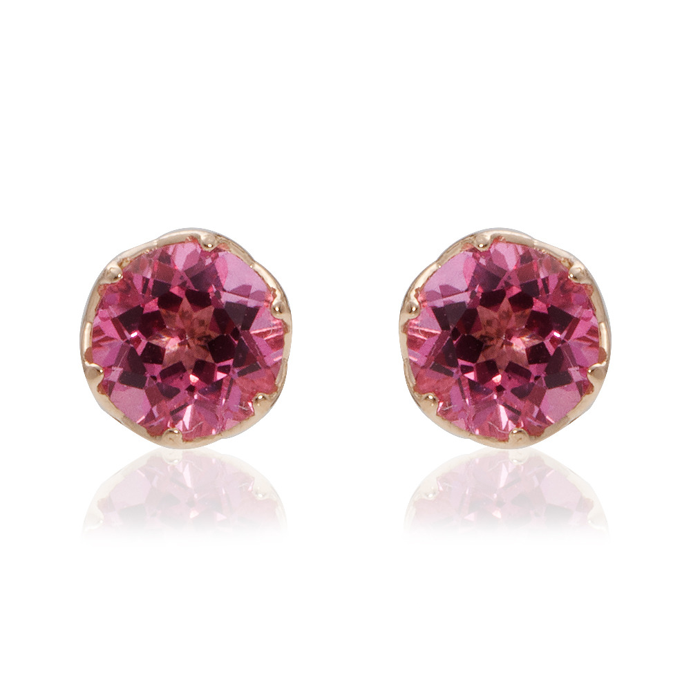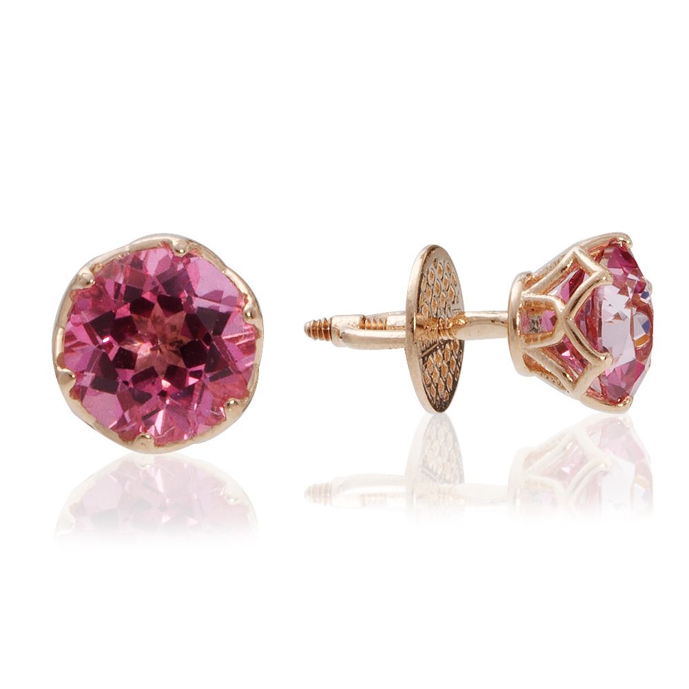 Золотые серьги гвоздики "лотос" с розовым круглым топазом